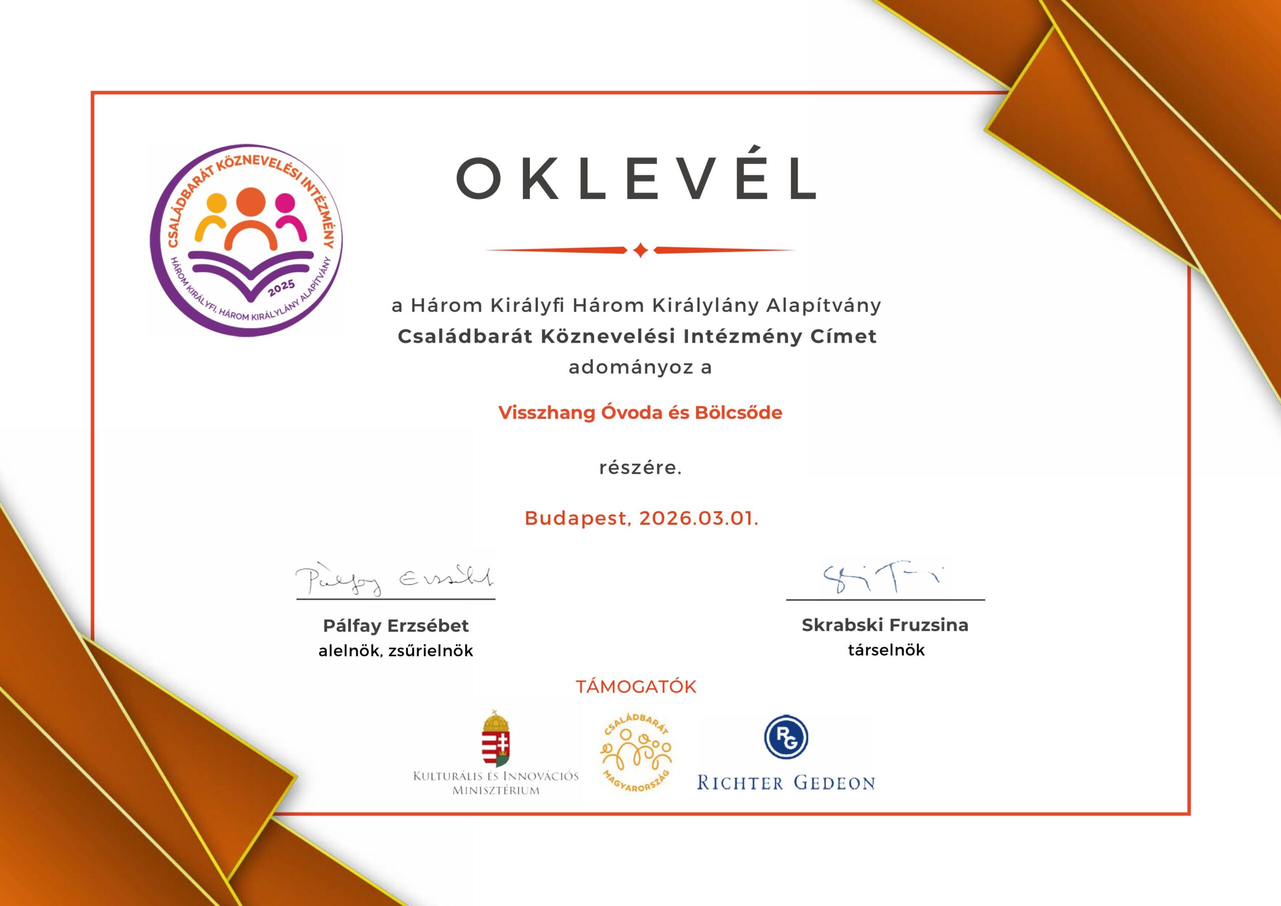 • Családbarát Köznevelési Intézmény oklevél
